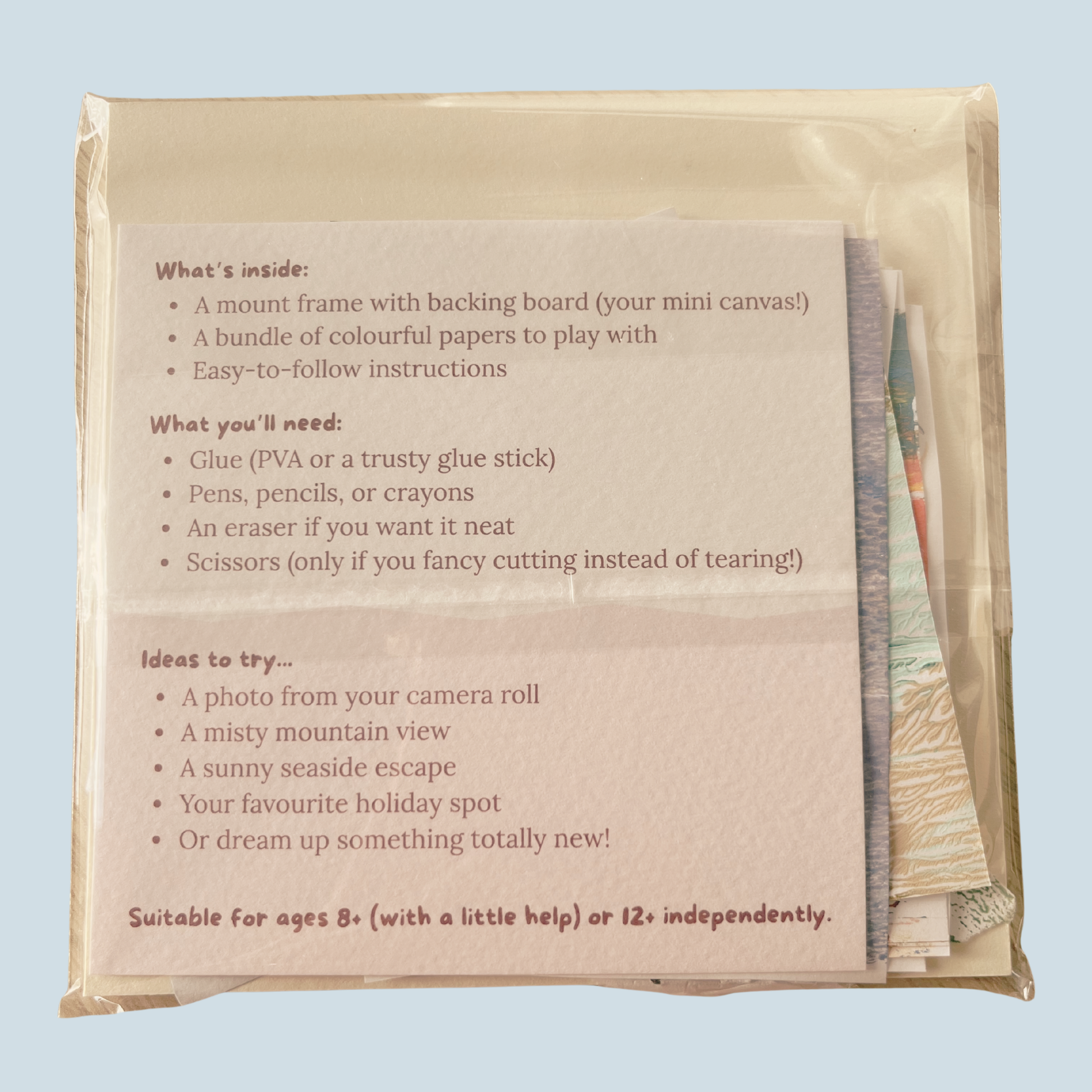 - A mix of unique coloured papers for tearing and layering